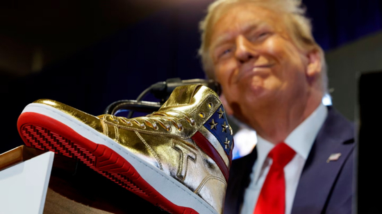 ◆今年2月,特朗普在费城一个鞋类贸易展上推广他价值 399 美元的金色高帮运动鞋。