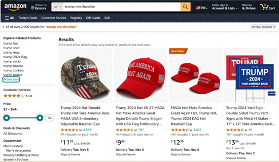 在海外最大网购平台亚马逊上搜索“特朗普周边”,带有Trump24和MAGA字样的棒球帽仅在过去一个月内的销售量就超过4000。