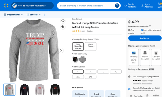 ◆沃尔玛网站上出售的特朗普卫衣,售价14.99美元。