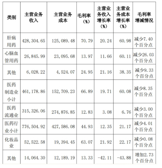 分行业来看,公司的主营业务由三部分构成:医药制造、医药流通和化妆品。