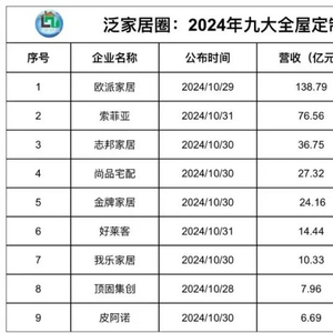 欧派138.8亿、索菲亚76.6亿、志邦36.8亿、尚品宅配27.3亿、金牌24.2亿等,九大定制家居上市企业三季度报全览