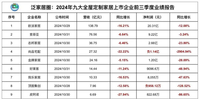 截至目前, 九大定制家居上市企业已全部公布2024年前三季度财报。