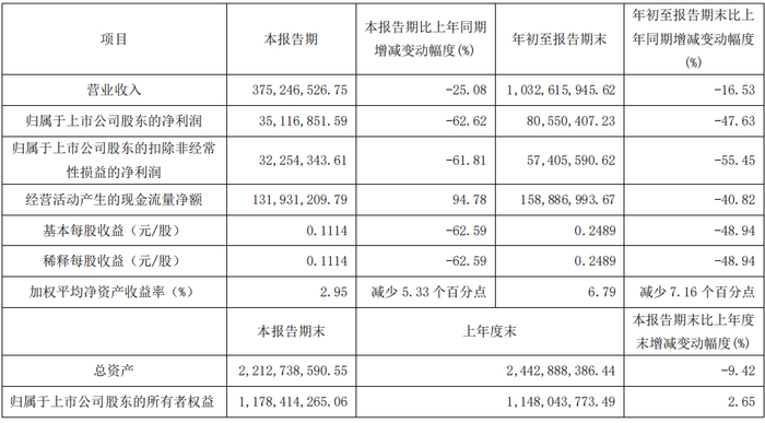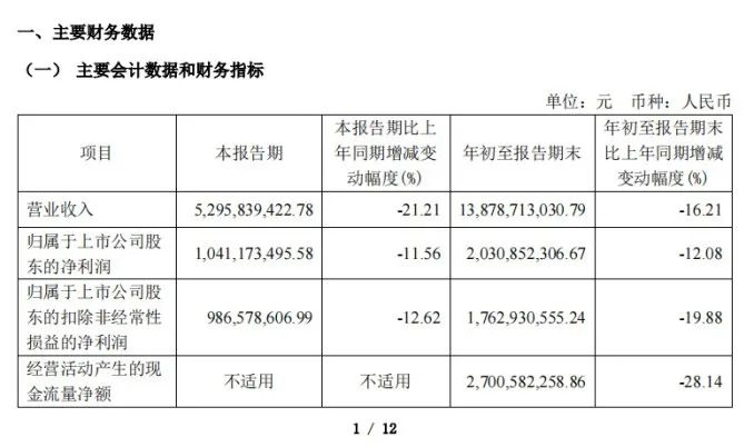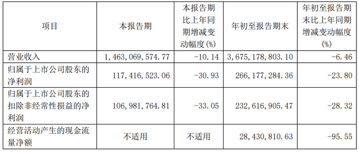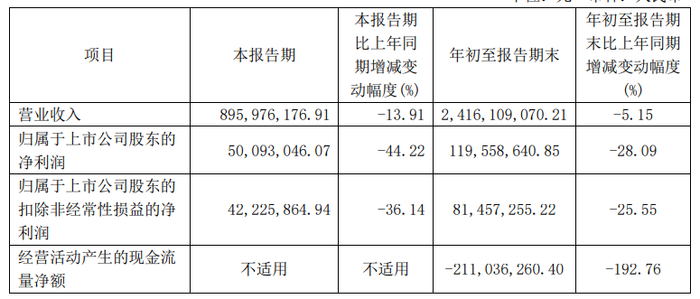此外,归属于上市公司股东的扣除非经常性损益的净利润为3454万人民币,同比下降了52.84%;年初至报告期末的扣除非经常性损益的净利润为6464万人民币,同比下降了51.06%。