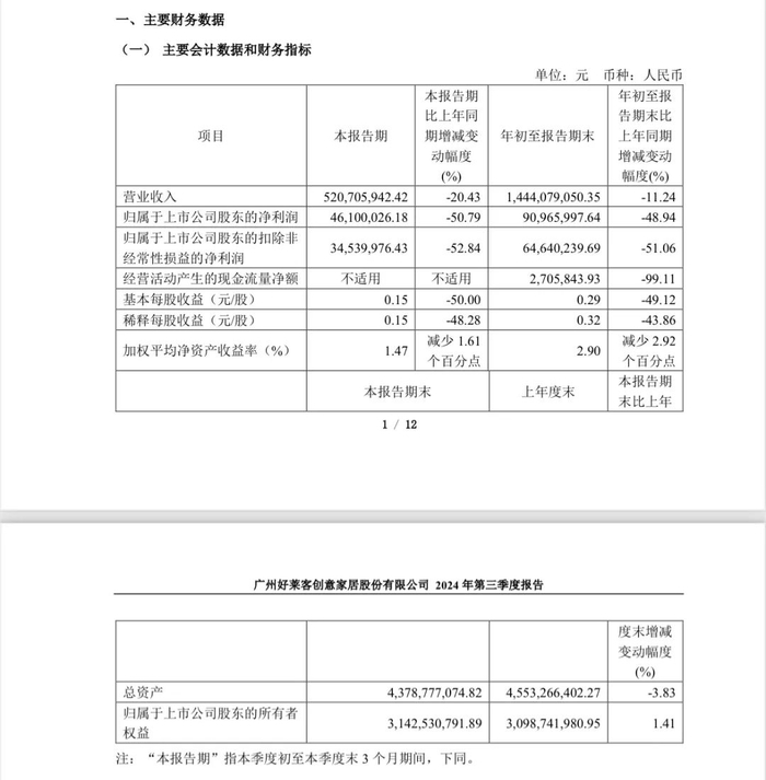 10月30日,好莱客发布了2024年第三季度业绩报告。