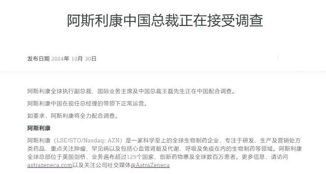 阿斯利康中国区“一把手”王磊正在配合调查。