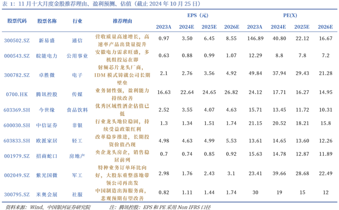 预期管理+外围国际市场影响是关键,市场将震荡向上。此前A股大涨的两个主导因素中的政策预期带来的催化边际减弱,但仍是当前影响市场的主要因素。11月有多个重要会议需关注,十四届全国人大常委会第十二次会议11月4日至8日在北京举行,预计11月8号之后会有大规模增量政策落地;另外需要关注十一月美国大选情况,但外因结果并不会改变我们的趋势。短期内的市场波动性将受到多重因素共振的影响,然而影响A股中期趋势的根本是国内基本面+预期管理。随着A股三季报披露完毕,业绩端要转向看其边际变化。今年业绩差的板块及公司,三季报已经把利空出尽,盈利预测下调,其中消费板块有困境反转的可能,明年有可能业绩好转,后面看政策刺激拉动基本面改善。未来伴随政策加码,A股估值中枢有望持续抬升。11月配置的投资策略应当聚焦受益于政策助力的成长型价值股。11月我们建议布局科技、军工、非银、消费等板块里的价值股。