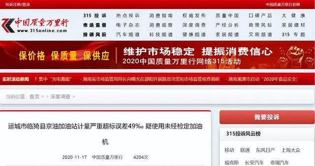 2020年11月中国质量万里行曾经发表文章,称山西运城临猗县京油加油站计量严重超标误差49‰,疑使用未经检定加油机。
