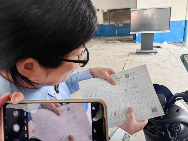 一位车主从义桥骑着一辆新电动车过来上牌。工作人员仔细查验了3C认证,扫码对比了图示和实车的一致性,但是车主 没带来产品合格证,只能下午带过来后再上牌。工作人员告诉他,尽快过来办理,到11月就无法办理上牌手续了。