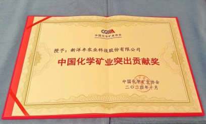 10月30日,中国化学矿业协会授予新洋丰“中国化学矿业突出贡献奖”,以表彰其在磷矿选矿技术方面不断研究、推动中低品位磷矿石综合利用方面所做的工作和取得的成绩。
