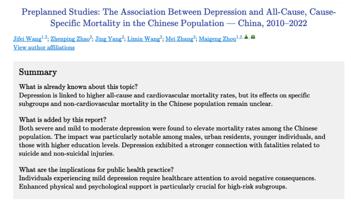 1. Wang J, Zhao Z, Yang J, et al. The Association Between Depression and All-Cause, Cause-Specific Mortality in the Chinese Population—China, 2010–2022[J]. China CDC Weekly, 2024, 6(40): 1022-1027.