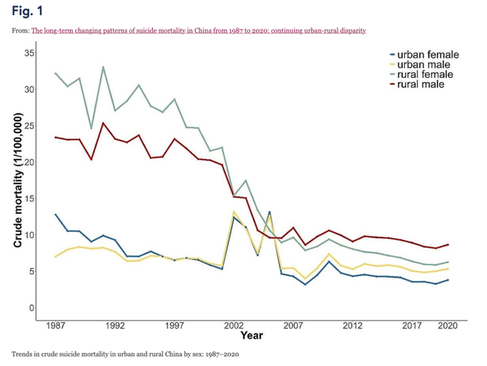 北京大学第六医院社会精神病学与行为医学研究室主任黄悦勤等在2024年发布了《The long-term changing patterns of suicide mortality in China from 1987 to 2020: continuing urban-rural disparity》(《1987 年至 2020 年中国自杀死亡长期变化模式》)。