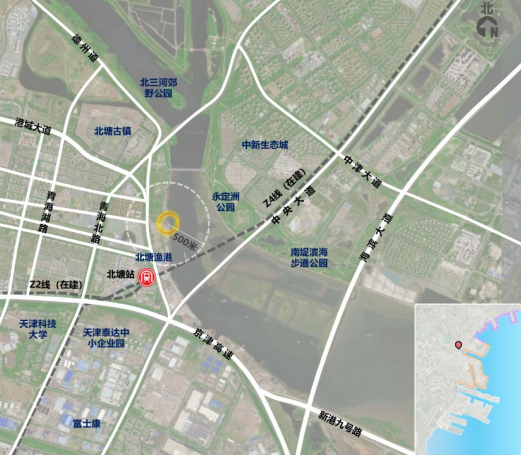 位于天津市滨海新区北塘街北塘渔港附近,地处蓟运河、永定新河、潮白新河三河入海口,滨海新区十大战役之“北塘经济区建设”中心区。