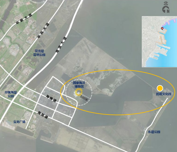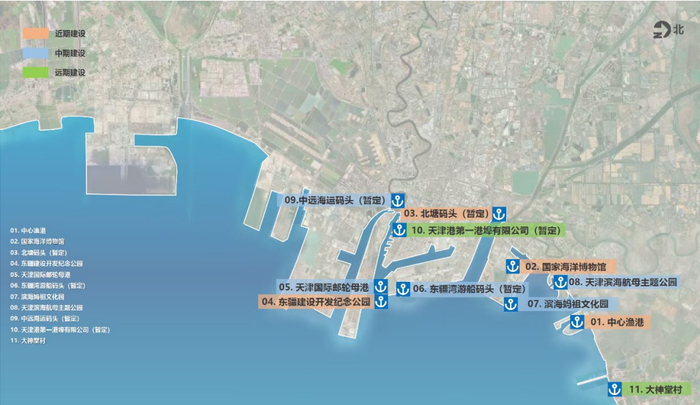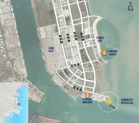 沿海点位4处,中心渔港、国家海洋博物馆、北塘码头(暂定)与东疆建设开发纪念公园。