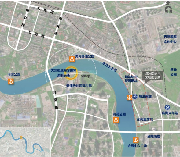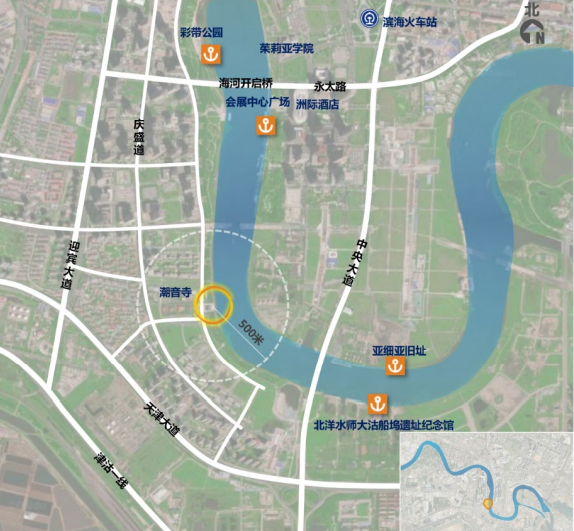 该选点位于海河南岸,天津极地海洋世界北侧,东侧为响螺湾月亮岛地块, 与海河外滩公园隔河相望。