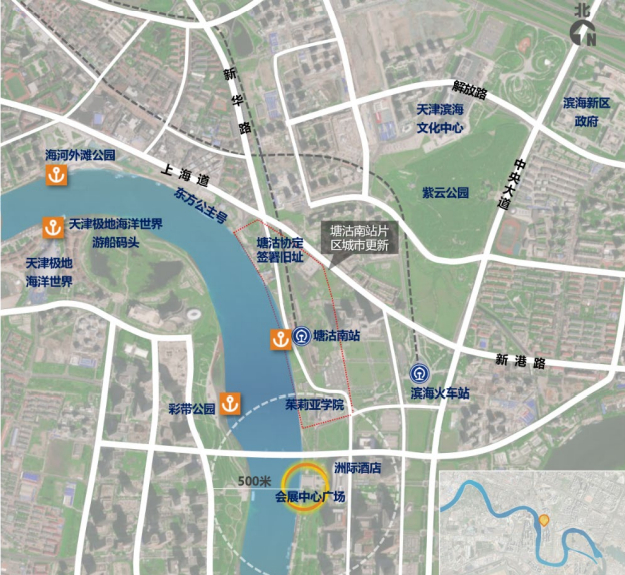 该选点位于海河北岸,河滨公园、滨海新区博物馆南侧,与大沽化工厂地块 隔河相望。周边为人口密集的成熟住区。
