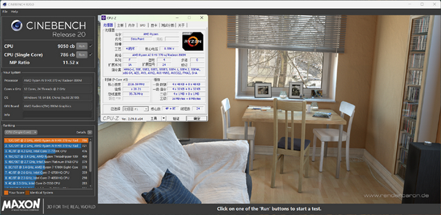 在CINEBENCH R20测试中,单线程成绩为786,多线程为9050。