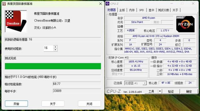 锐龙AI 9 HX 370的相对性能倍数为68.77,每秒33009千步。