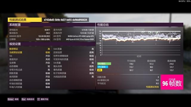 在《极限竞速:地平线5》1080P+极端画质下,平均帧数为96 FPS。