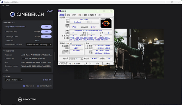 在CINEBENCH 2024测试(默认多轮测试)中,单线程成绩为112,多线程为1162。