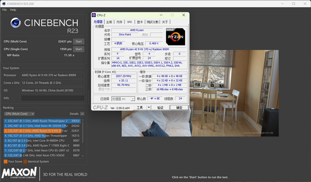 在CINEBENCH R23测试中,单线程成绩为1950,多线程为22431。