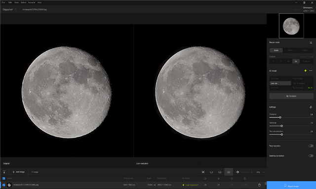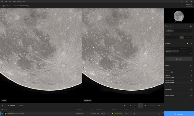 之后测试一下GigaPixel的AI扩图性能,使用GigaPixel对一张660x660分辨率的月球照片进行6倍放大,生成一张3960x3960的图片,放大后的图片上月球的环形山清晰可见。