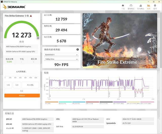 在Fire Strike Extreme(DX11+2K分辨率渲染)测试项目中,RTX 4060 Laptop图形分数为12273。