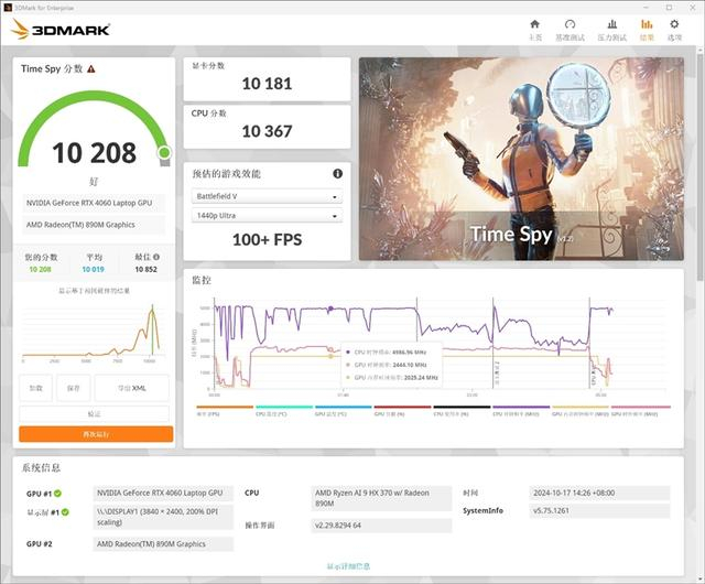 在3DMark的Time Spy(DX12+2K)测试项目中,RTX 4060 Laptop图形分数为10208。