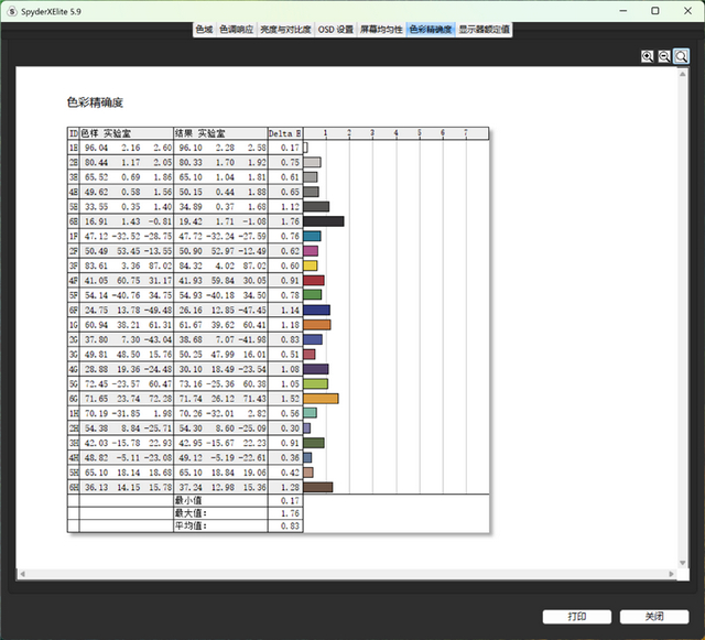 在色彩精准度上,实测Delta-E最大值为1.76,最低值为0.17,平均为0.83,素质极为优异。