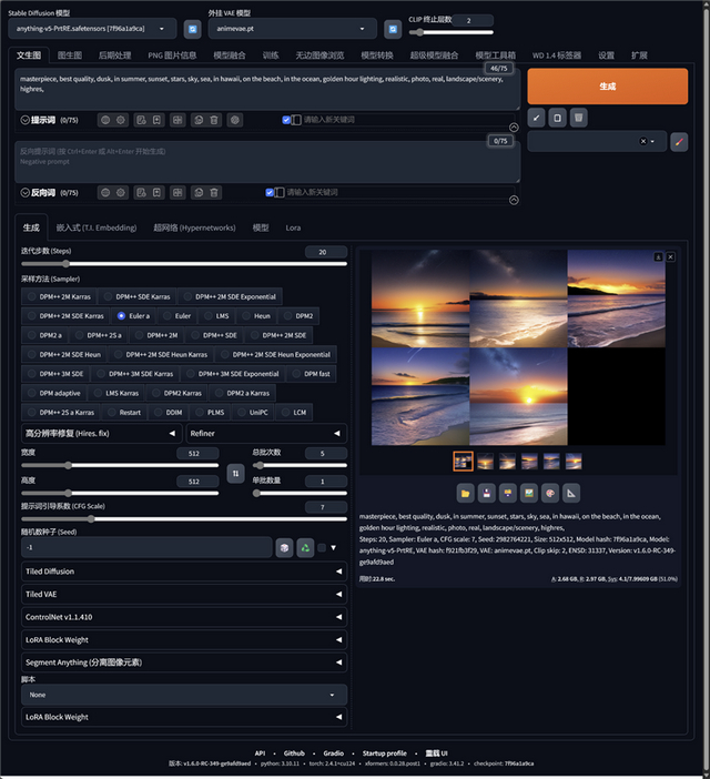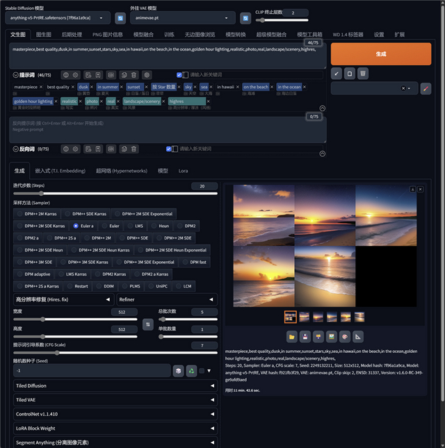 测试使用anything v5模型,46个关键字,采样方法为Euler a,分辨率为512×512、迭代步数20。