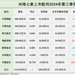 继2023年第三季度七家上市航司集体重回盈利状态后,今年第三季度上市航司延续增长势头,再度宣告全部盈利。