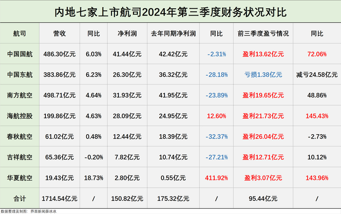 但是今年七家上市航司中有五家净利润同比下滑,由此导致第三季度净利润总和不及去年同期,从去年的175.32亿元减少至今年的150.82亿元。