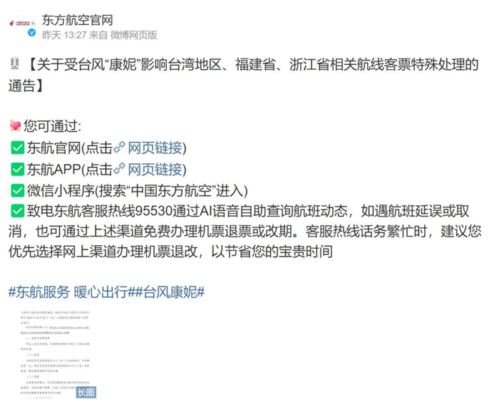 东航发布变更及退票政策