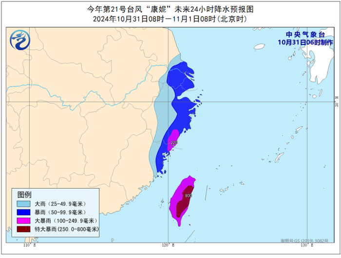 10月31日08时至11月1日08时,福建东北部、浙江中东部、上海、江苏南部等地有暴雨,其中,福建东北部、浙江东部等地的部分地区有大暴雨(100-220毫米);台湾岛有大暴雨,台湾岛东部的部分地区有特大暴雨(250-800毫米)。