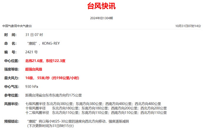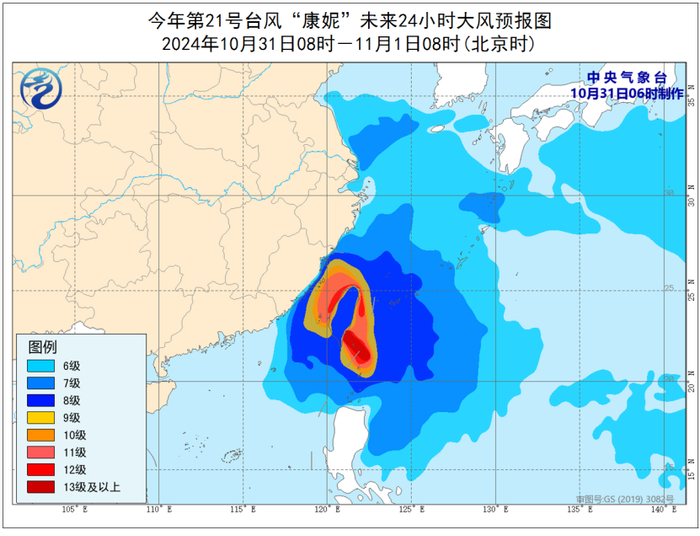 10月31日08时至11月1日08时,受冷空气和“康妮”的共同影响,东海大部及钓鱼岛附近海域、台湾海峡、台湾以东洋面、巴士海峡、南海北部及东沙群岛附近海域、浙江沿海、福建沿海、台湾岛沿海将有7-9级大风,阵风10-11级;其中台湾海峡、台湾以东洋面和巴士海峡的部分海域、台湾岛东部沿海、福建中部沿海的风力有10-12级,阵风13-14级,台风中心经过的附近海面风力有13-16级,阵风17级及以上。