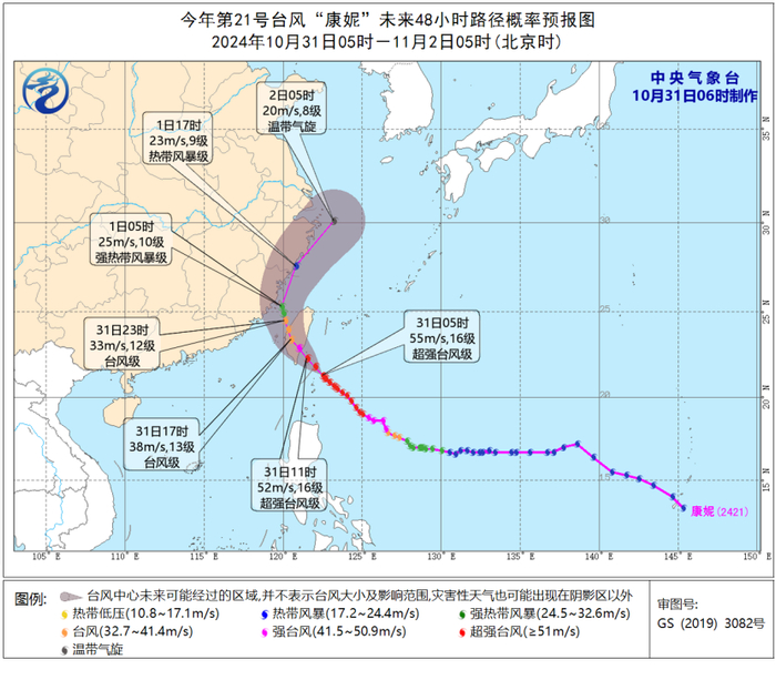 11月1日,旋转风,中北部沿海和台湾海峡9-10级阵风11-12级转5-6级阵风7-8级,南部沿海6-7级阵风8-9级转4-5级阵风6-7级。