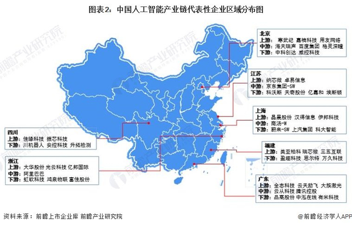从我国人工智能产业链企业的区域分布来看,主要集中在广东、北京、上海、江苏、浙江等地,其次是山东、福建、四川、湖北等省份。就人工智能产业链代表性企业的区域分布而言,北京、江苏、上海、广东和浙江的企业分布相对较为全面,涵盖了上中下游的代表性企业。在这些地区,北京拥有寒武纪、百度集团、海天瑞声等龙头企业,广东省有腾讯控股、大族激光、云从科技等领军企业,上海则有商汤科技、蔚来集团、科大智能等代表性企业。