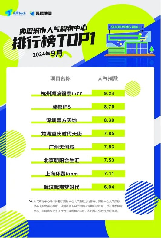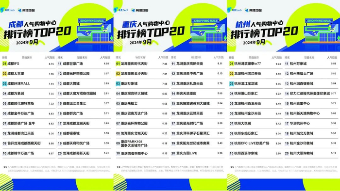 近日,赢商tech与高德地图联合发布了《人气购物中心排行榜》,该榜单通过线下到访客流规模、活跃度,及地图搜索、点击、导航等热度指标综合评测,在全国6800+购物中心中,找出实力坚挺的人气王。同时也为全国8大主流城市的160个购物中心的人气进行打分。其中,在2024年9月典型城市人气购物中心总榜单中,来自准一线城市的购物中心可以说是表现非常抢眼,杭州湖滨银泰in77、成都IFS和龙湖重庆时代天街三个项目纷纷冲入全国TOP5。