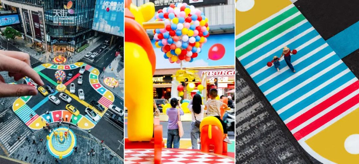 今年春节,龙湖重庆时代天街在C\D\E馆交汇十字路口放置了“天街庙会”装置,人行道化身红白色连廊,围绕着巨型灯笼,年味buff叠满;4月,巨型联名包包椅、联名涂鸦现身路口;到了儿童节,时代天街十字路口变身巨幅“飞行棋”上,看着“棋盘”中央的彩虹气球,一秒回到童年……