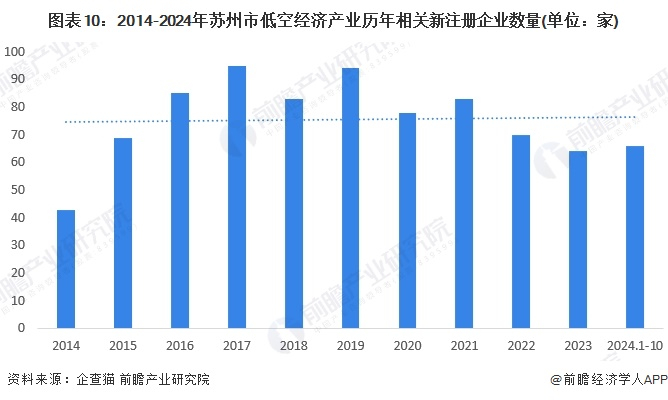 根据企查猫查询数据显示,近年来低空经济产业相关企业数量超过1000家。截至2024年10月,苏州低空经济产业相关的注册企业2017年新注册企业数量最高,为95家,其次是2019年94家;苏州企业布局低空经济较早,具有市场先发优势。2023年全年,苏州市新增低空产业相关企业数量64家。整体来看,苏州市低空经济产业的发展热度在提高。