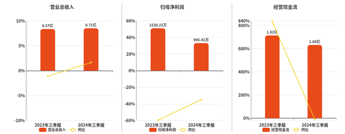公司营业总收入为8.71亿元,在已披露的同业公司中排名第13,较去年同报告期营业总收入增加1403.94万元,同比较去年同期上涨1.64%。归母净利润为995.41万元,在已披露的同业公司中排名第11,较去年同报告期归母净利润减少534.80万元,同比较去年同期下降34.95%。经营活动现金净流入为1.60亿元,在已披露的同业公司中排名第8,较去年同报告期经营活动现金净流入减少2080.77万元,同比较去年同期下降11.49%。