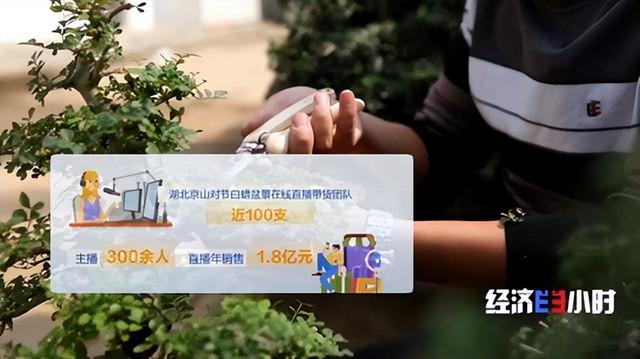 2023年,湖北京山对节白蜡盆景在线直播带货团队近100支,主播300余人,直播年销售1.8亿元。