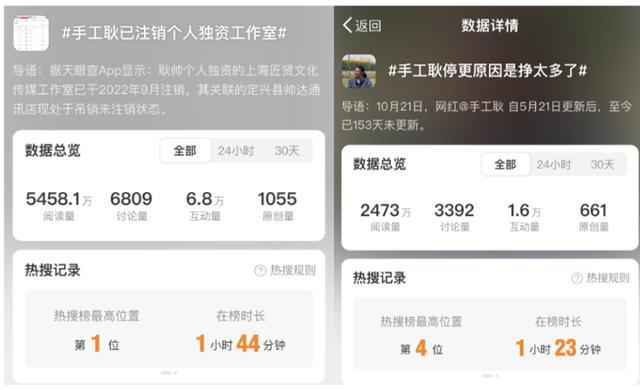 此前,网红“手工耿”因长期未更新视频,被网友怀疑“退网”。词条#手工耿已注销个人独资工作室##手工耿停更原因是挣太多了#相继登上微博热搜榜。
