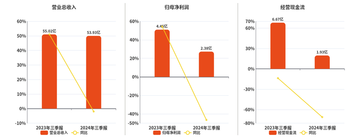 公司营业总收入为53.93亿元,在已披露的同业公司中排名第5,较去年同报告期营业总收入减少1.08亿元,同比较去年同期下降1.97%。归母净利润为2.38亿元,在已披露的同业公司中排名第10,较去年同报告期归母净利润减少2.07亿元,同比较去年同期下降46.53%。经营活动现金净流入为1.93亿元,在已披露的同业公司中排名第7,较去年同报告期经营活动现金净流入减少4.74亿元,同比较去年同期下降71.04%。