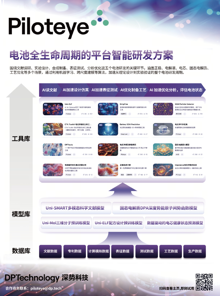 近年来,电池研究和产业领域取得了显著的成就。从微观层面对电池材料的深入研究,到器件层面电芯的设计和制造,再到宏观层面电动交通工具和储能电站的电池管理系统(battery management system,BMS),众多创新技术不断涌现。这些技术进步推动了电池领域学术论文、研究报告、专利、学术会议数量的急剧增长,每年发表的相关研究文献数以万计。因此,领域信息增长速度迅猛,数据量庞大且呈现多模态、高度分散的特点。这导致研究和产业人员经常面临信息过载和知识盲区的挑战,严重影响了研究的效率和创新的速度。在这种背景下,传统的研究范式显得效率不足,亟需改进以适应快速发展的行业需求。