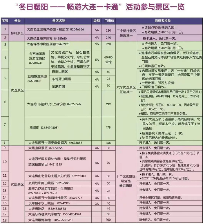 据了解,“冬日暖阳——畅游大连一卡通”面值199元,可以在2家标杆景区任选其一、在5家优质景区任选其一、10家优选景区可全选畅游嗨玩。