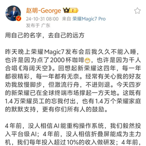 10月31日,荣耀CEO赵明也在微博上发文称,4年前,没人相信AI能重构操作系统,荣耀毅然投入平台级AI;4年前,没人相信折叠屏能成为主力机,荣耀每年投入超过10%的收入做研发;4年前,没人相信荣耀能重返国际舞台,今年荣耀第一次激活HONOR.com全球顶级域名,“我们正用自己的名字,去自己的远方”。