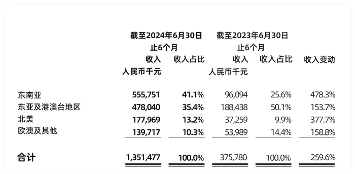 根据财报数据,截至2024年6月30日,泡泡玛特海外市场营收达13.5亿元,同比增幅为259.6%,占总营收的比例接近30%。其中,东南亚地区以5.6亿元的营收位列第一,占比超过四成之多。