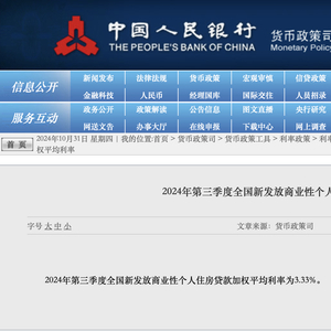 10月31日,该栏目公布,2024年第三季度全国新发放商业性个人住房贷款加权平均利率为3.33%。