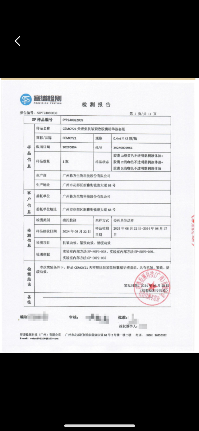抖音“CEMOY护肤旗舰店”工作人员则发来一份《检测报告》。报告显示,CEMOY21天密集抗皱紧致胶囊精华液套组生产商为广州栋方生物科技股份有限公司。2024年8月的检测项目为“抗皱功效、紧致功效、舒缓功效”,检测依据为“实验室内部方法”,检测结论为“本次试验条件下,样品CEMOY21天密集抗皱紧致胶囊精华液套组具有抗皱、紧致、舒缓功效”。该检测机构为赛谱检测科技(广州)有限公司。