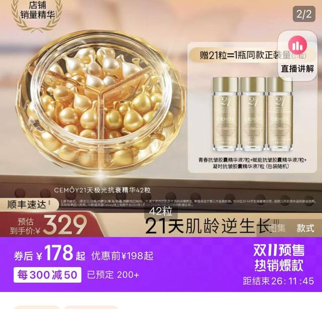 在“CEMOY澳诗茉淘宝官方旗舰店”,该精华液仍在预售阶段,24粒精华胶囊价格为178元,42粒价格为329元。在抖音“CEMOY护肤旗舰店”,主播则以护肤套盒的形式带货,价格为499元一套。目前,该款产品在淘宝已有超2000人付款,而抖音旗舰店则已售出千余件。